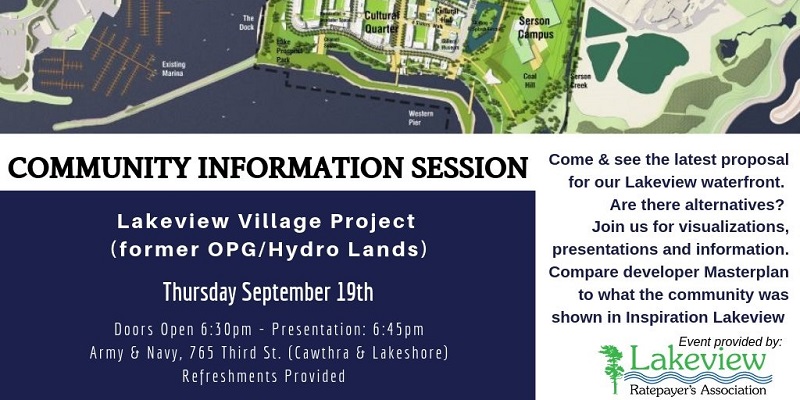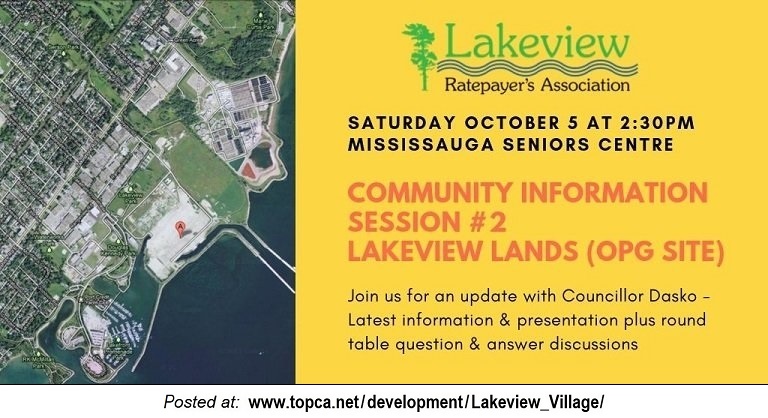 This is an opportunity to ask questions of the City of Mississauga Planning Staff, Councillor Dasko and the developer (Lakeview Community Partners) in a public forum. Over the past 14 months, Lakeview residents have raised a number of points (itemized here) and this is an opportunity to have the parties together to discuss and ideally resolve.