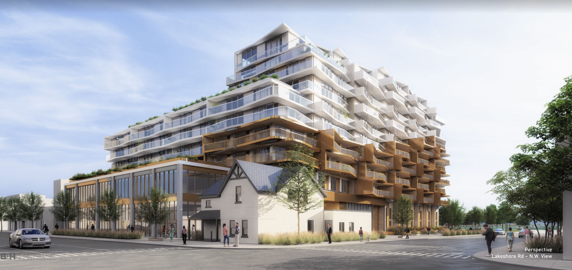 IMAGES: The concept renderings shown above are pre-DARC and do not reflect any of the requests or further revisions that will appear in the formal application. Left: Lakeshore Road East NW perspective. Right: Port Street East SW perspective.