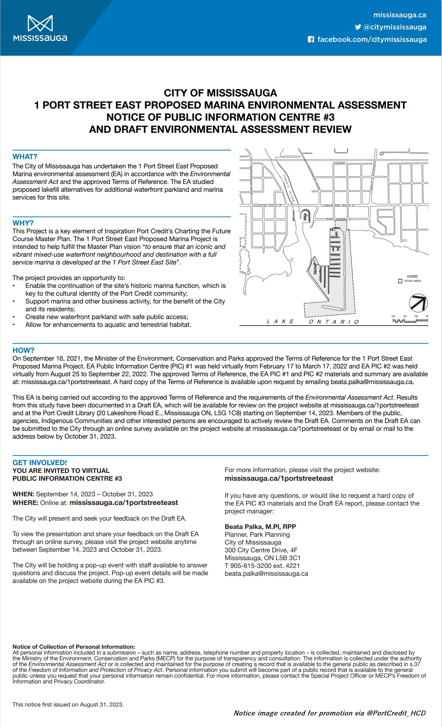 "The City of Mississauga is initiating an Individual Environmental Assessment under Ontario’s Environmental Assessment Act for the 1 Port Street East Proposed Marina Project. The environmental assessment will study the proposed expanded land base for additional waterfront parkland and examine marina alternatives for this site. The City recognizes that this project may affect your interests and is reaching out to begin engagement on the 1 Port Street East Proposed Marina Project.
