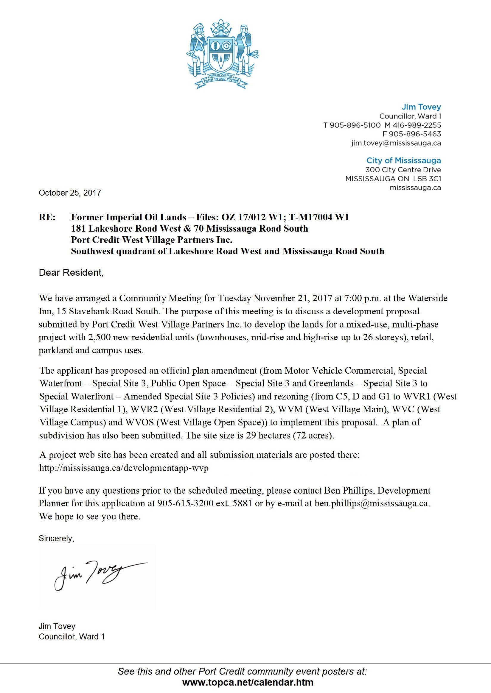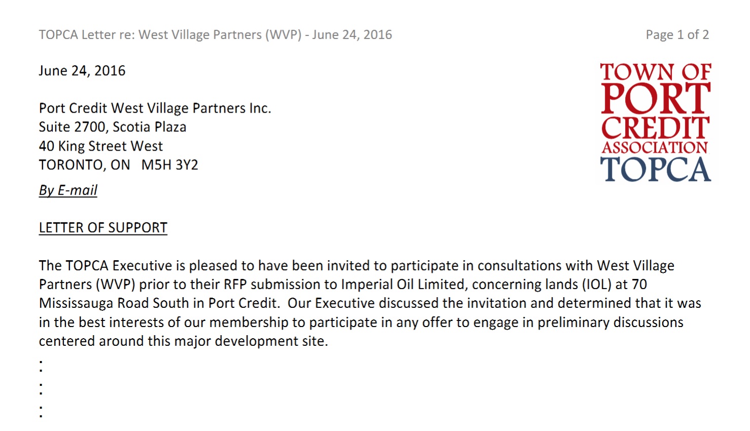 ► View the TOPCA Statement (March 10, 2017) (1p PDF) regarding Public Process at the 'West Village Port Credit' brownfield development site (formerly, Imperial Oil lands).