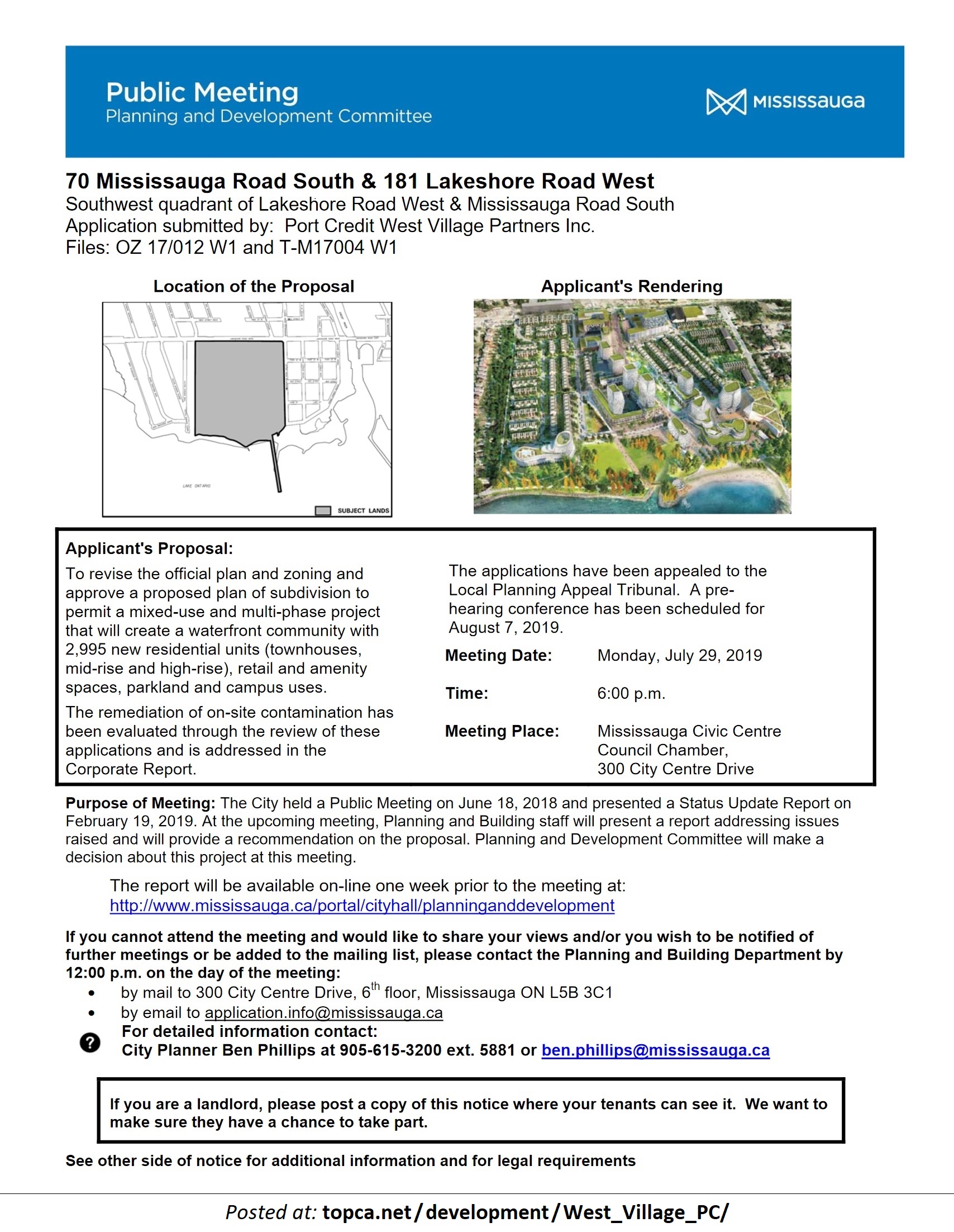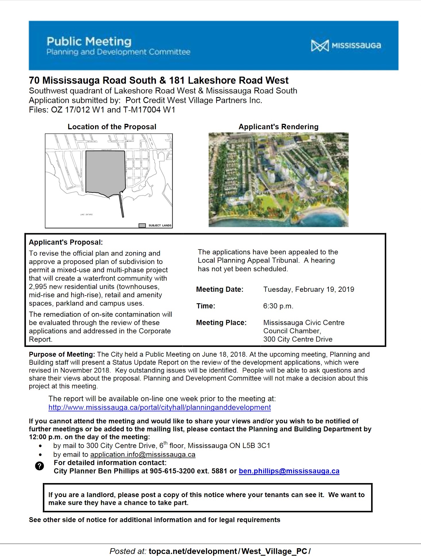 PUBLIC MEETING: Monday, June 18, 2018 @ 6:30 pm at City Hall (Council Chamber). This statutory public meeting of the Planning and Development Committee (all of Council) will address the West Village Port Credit development proposal and welcomes public comment.
