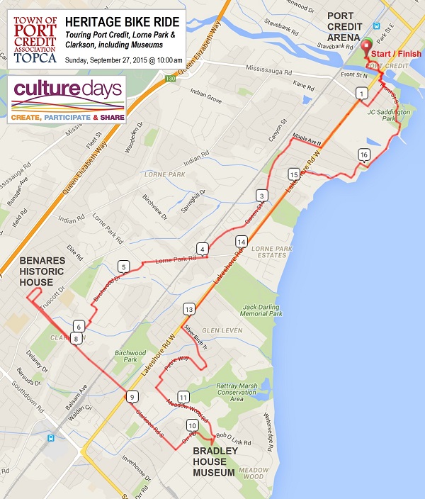 In 2014 we toured the east side of Port Credit for Culture Days (click for interactive map of the eastside tour). This year we will tour the west side of Port Credit and go as far as the two (2) museums in Clarkson! (17.8 km round-trip).