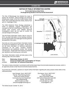 The City has initiated this study (Notice) to assess the shoreline, natural heritage and servicing infrastructure needs of Port Credit Memorial Park West, Marina Park (boat launch) and Saddington Park in advance of re-designing the three (3) harbour-area parks.